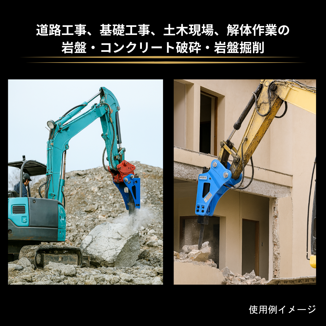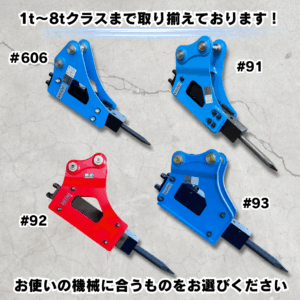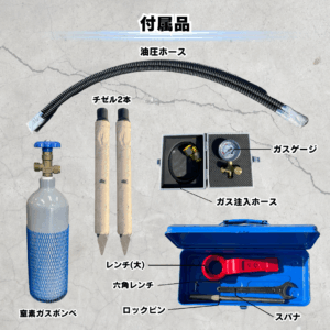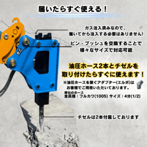 | 付属品 | ・バケットピン2本 ・スペーサーシム(必要な場合のみ) ・ツールボックス ・油圧ホース2本 ・ガスボンベ(窒素) ・アダプター(圧力計付き) ・チゼル2本 ※ワンタッチは付いておりません |