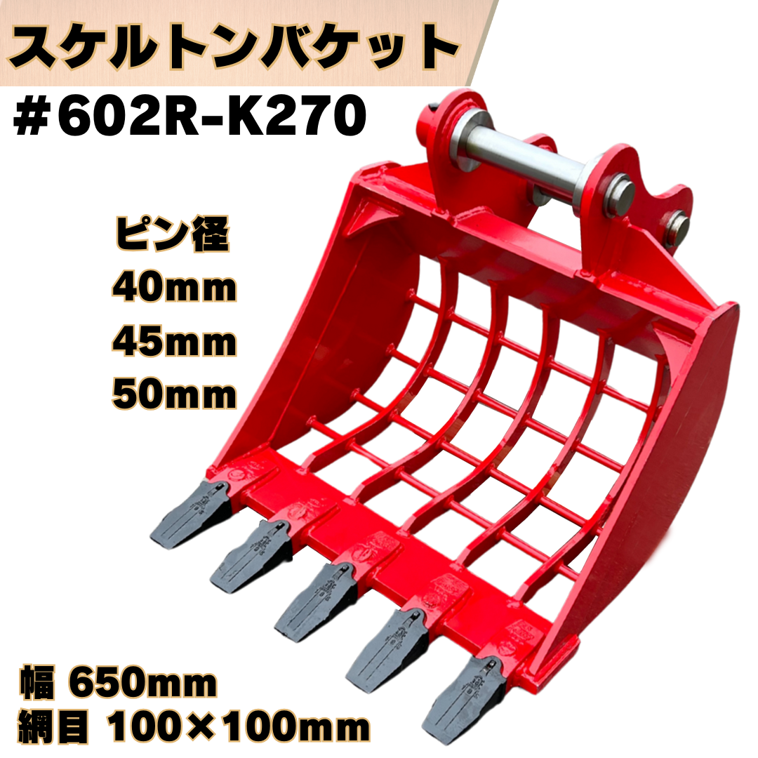 スケルトンバケット ピン間距離270 ピン径40・45・50mm対応 網目100×100 幅650mm コマツ クボタ ヤンマー コベルコ CAT 日立建機 IHI ハニックス 住友建機 等適合/ 重機 アタッチメント ユンボ バックホー #602R-K270 NAKATAKI