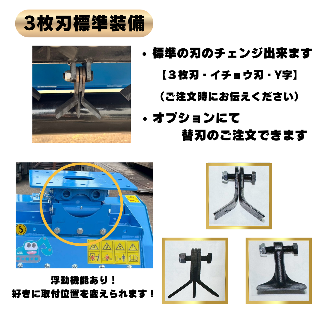| 備考 | ※アーム幅は、スペーサーシムにて対応いたします ※簡易塗装仕上げとなります ●3枚刃 ※オプションにてイチョウ刃・Y字ブレードもあります! ●浮動機能あり ●2本配管仕様 ●ポンプ・バルブ保護カバー付き |