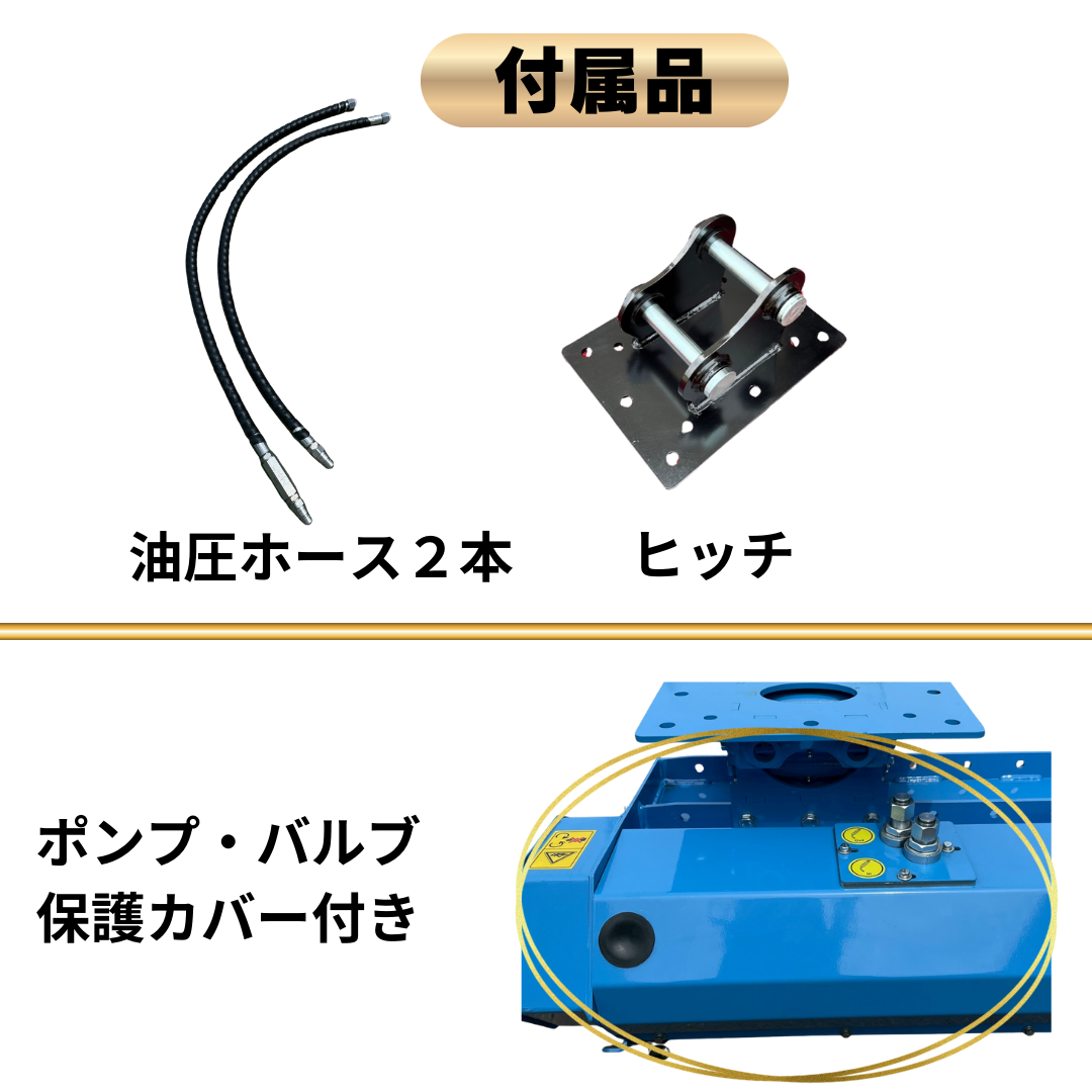 | 付属品 | ・ヒッチ ・バケットピン2本 ・スペーサーシム(必要な場合のみ) ・油圧ホース2本 ※ワンタッチは付いておりません |