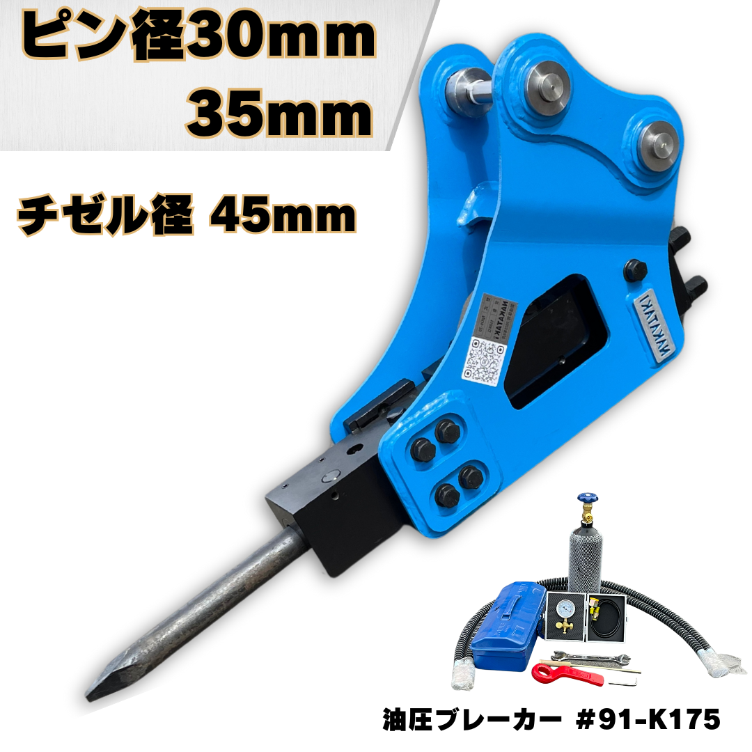 | 付属品 | ・バケットピン2本 ・スペーサーシム(必要な場合のみ) ・ツールボックス ・ガスボンベ(窒素) ・油圧ホース2本 ・アダプター(圧力計付き) ・チゼル2本 ※ワンタッチは付いておりません |